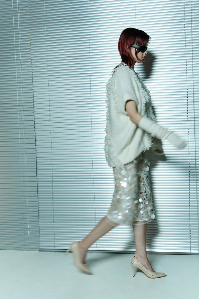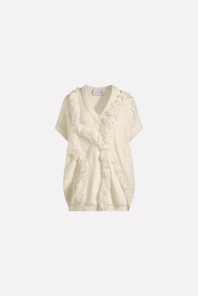 MAXI GILET IN MISTO LANA MOHAIR SFRANGIATO FRONTE RETRO, SCOLLO A V, VESTIBILITÀ OVERSIZE, LUNGHEZZA SOTTO BACINO.