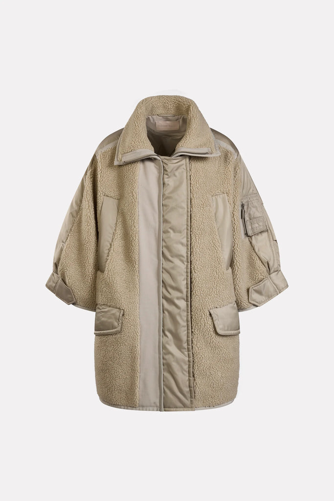 MAXI PIUMINO OVERSIZE MISTO TEDDY CON COLLO ALTO, IMBOTTITURA MISTO PIUMA VERA, MANICHE A 3/4, LUNGHEZZA SOTTO AL BACINO.