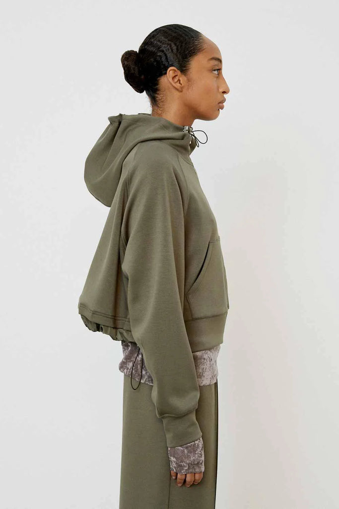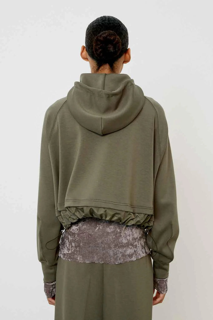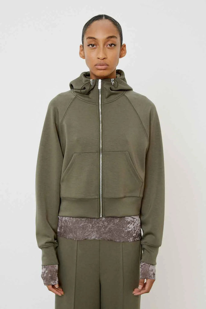 GIACCA A MANICHE LUNGHE CON CAPPUCCIO, COULISSE INTERNA, CERNIERA DI METALLO SUL DAVANTI E BOTTONI SUI FIANCHI